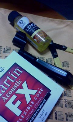 上の”LEMON”と書かれているのが、ギター用レモンオイル(ネット通販サイトを参照) というものです。弦を外した際に指板(フィンガーボード:実際にコードなど弦を押さえたりする部分)をケアするためのものです。